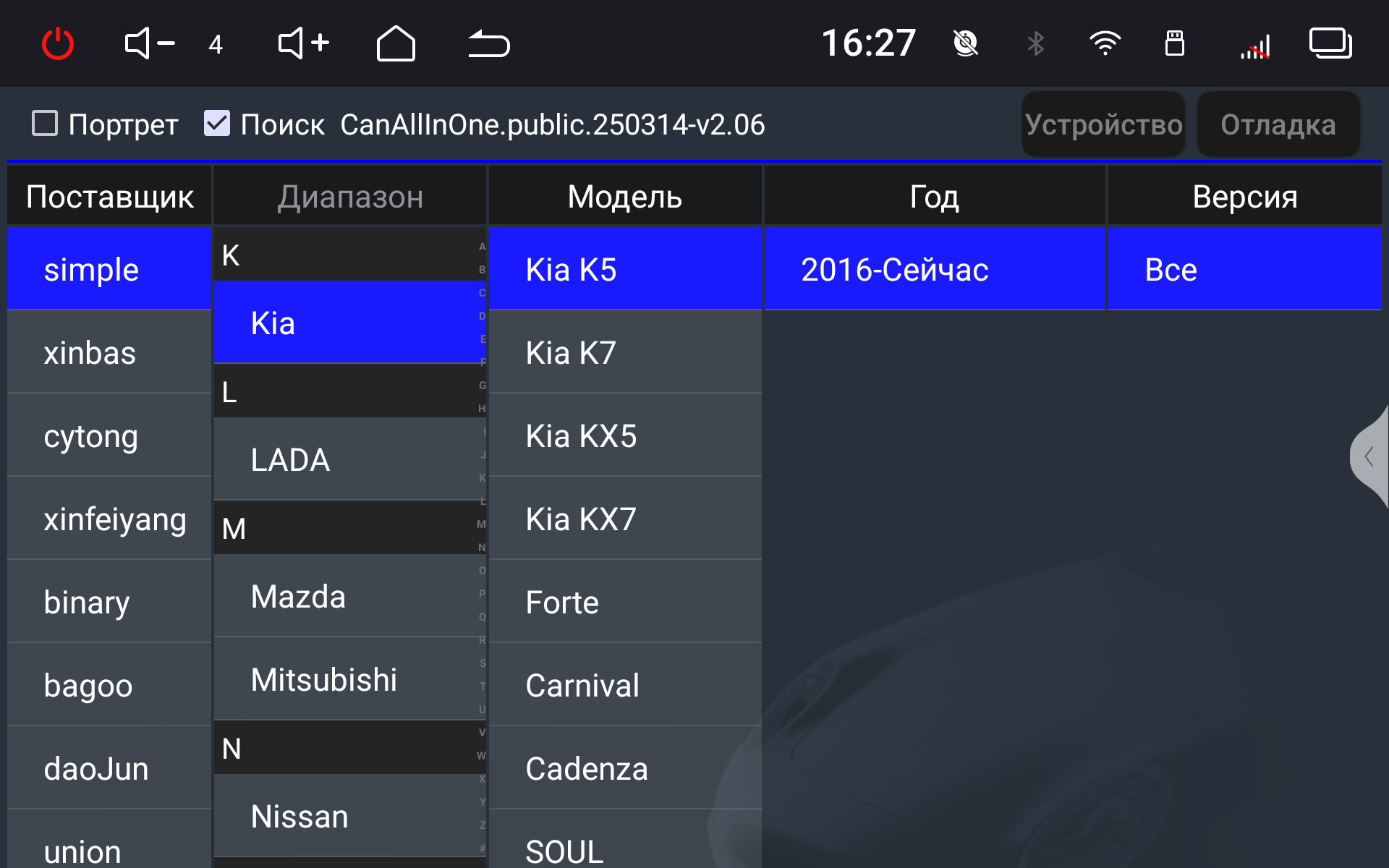 - Подключение камер переднего и заднего вида аналоговых и цифровых (AHD).