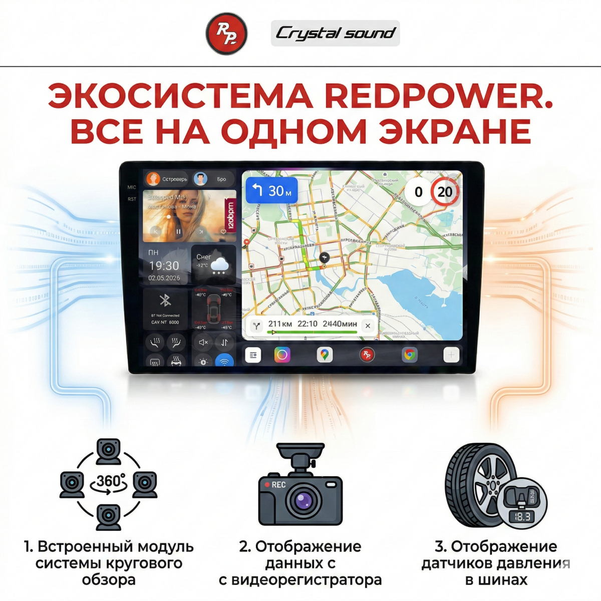 Поддержка системы контроля давления в шинах (TPMS)- это отображение всей информации о ваших колесах прямо на экране магнитоле в реальном времени! Вы получите мгновенное звуковое предупреждение и сможете сразу же среагировать на проблему с колесом, избежав опасной аварийной ситуации на трассе. Это может спасти жизнь вам и вашей семье на высокой скорости. На нашем сайте есть внешние и внутренние датчики давления в шинах RedPower (TPMS), с ними вы можете ознакомиться по ссылкам: внешние и внутренние.