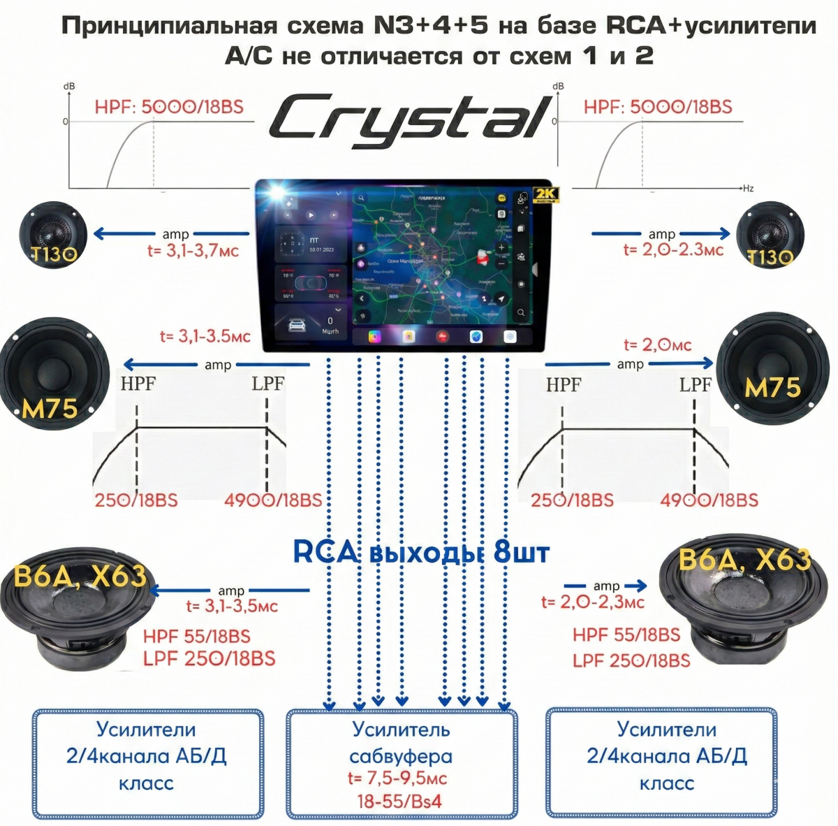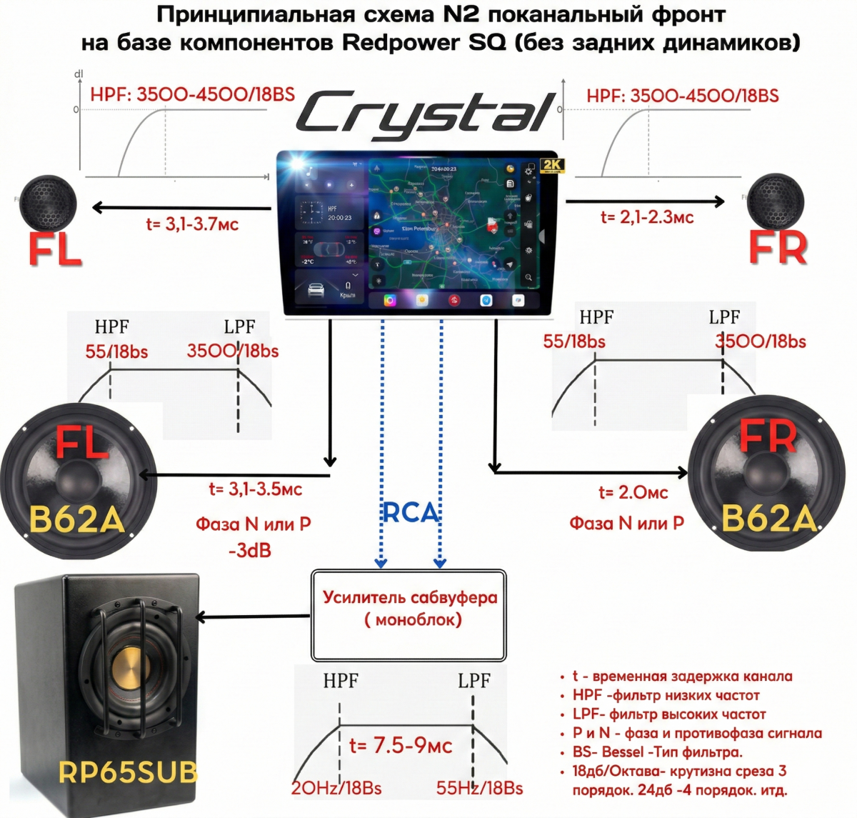 !!! Рекомендовано в такие типы систем добавлять DSP процессор. Чтобы избавиться от этих всех недостатков, которые описаны выше, а так же максимально сократить длину RCA по салону.
