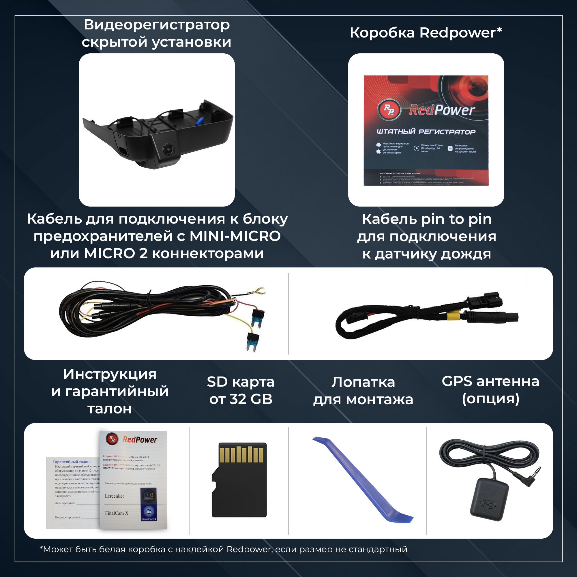 Компания Redpower рада представить новую линейку штатных регистраторов DVR-G серии. Отличия от N серии: новый чип позволяет записывать видео в разрешении 2,5K или 4K, новый сенсор Sony 335, возможность подключения GPS антенны и встроенный конденсатор.