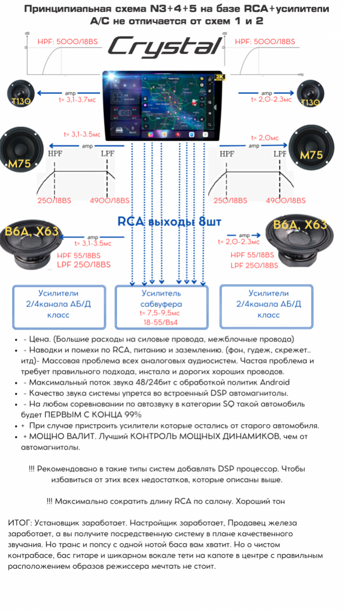 Ниже представлены базовые схемы подключения и создания аудиосистем. Временные задержки и фильтры среза указаны как начальные и не являются окончательными и универсальными для всех автомобилей. Плюсы и минусы указаны субъективно, основываясь на собственном опыте