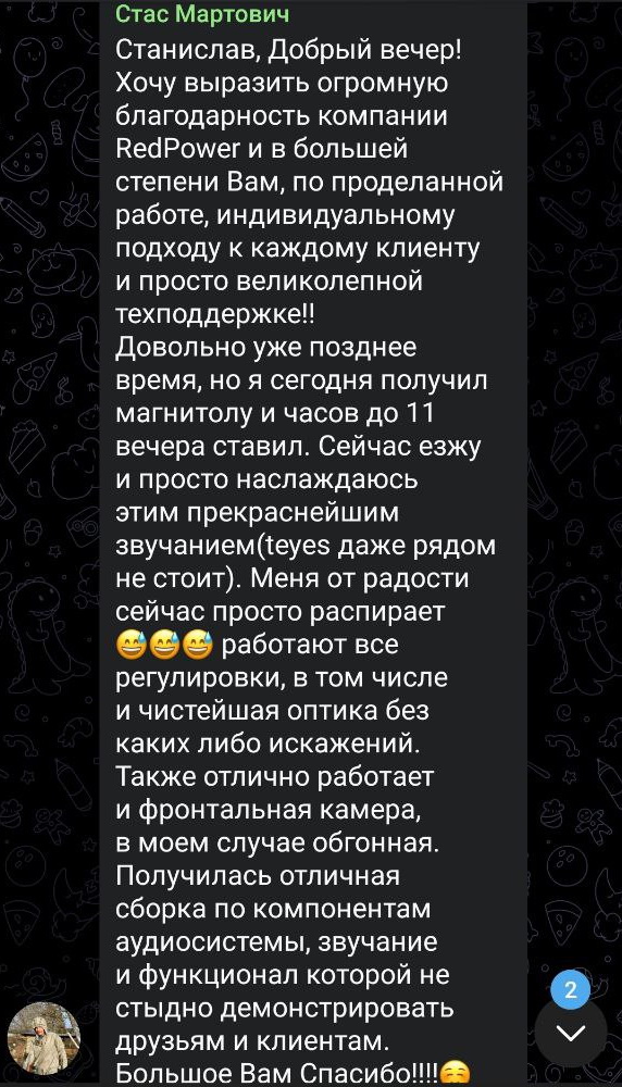 Хочу немного высказаться про купленную у Вас магнитолу. Своего рода это отзыв. Купив у Вас и установив магнитолу я сравнивая ее с тем недоразумением который у меня был до этого я понял, что я выбрав Вас ни капли не прогадал в покупке. Первое включение дало понимание в разнице работы того что было и то что у Вас куплено. звук ощутимо разница и он намного насыщеннее и качественнее. Удобство лаунчера на высоте и работа экрана намного отличается в лучшую сторону. В общем сказать работа магнитолы на все сто балов из ста. спасибо Вам.