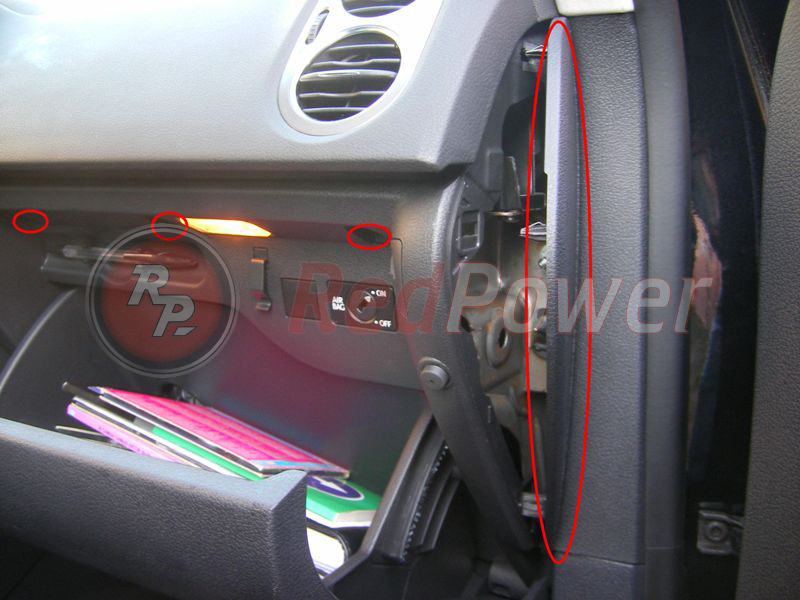 а) откручиваем: 3 винта сверху внутри бардачка (см. фото), 2 винта снизу под бардачком (на фото не показаны) и подцепляем боковую заглушку торпедо (см. фото);