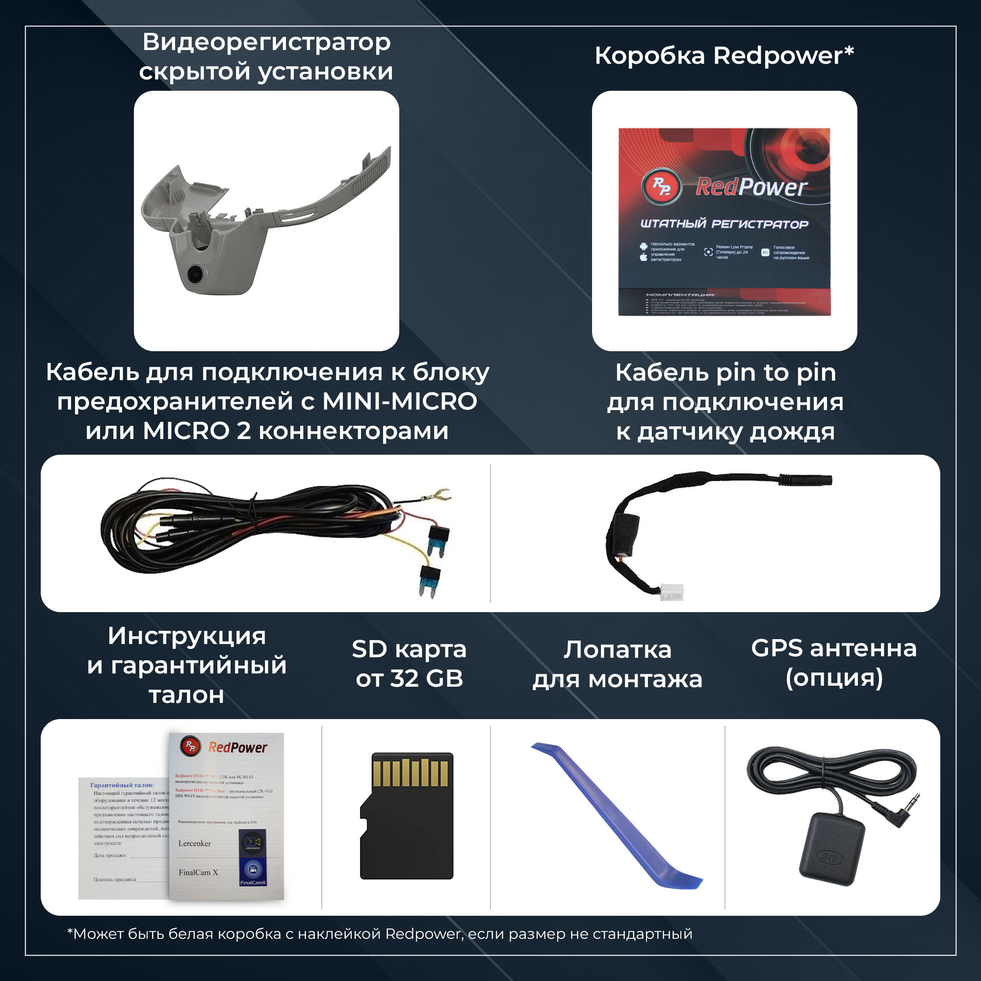 Компания Redpower рада представить новую линейку штатных регистраторов DVR-G серии. Отличия от N серии: новый чип позволяет записывать видео в разрешении 2,5K или 4K, новый сенсор Sony 335, возможность подключения GPS антенны и встроенный конденсатор.