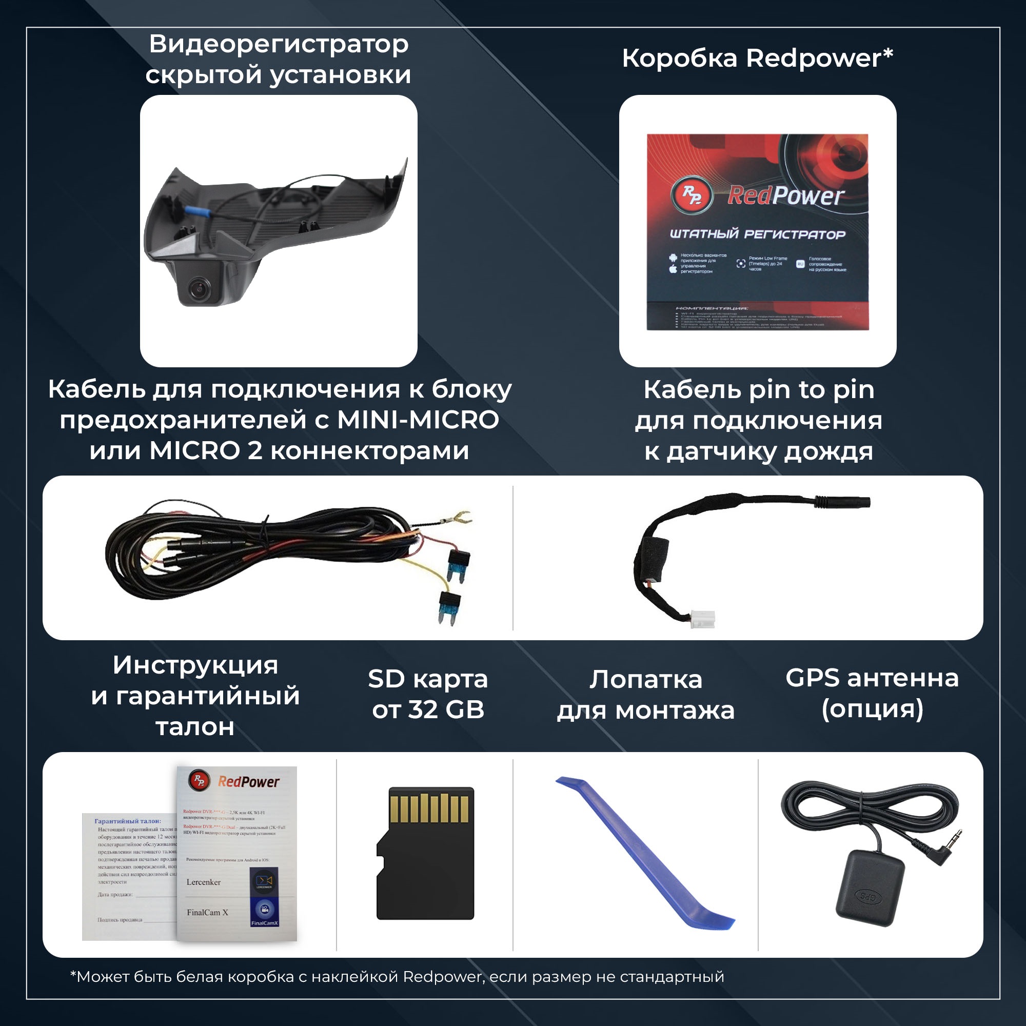Компания Redpower рада представить новую линейку штатных регистраторов DVR-G серии. Отличия от N серии: новый чип позволяет записывать видео в разрешении 2,5K или 4K, новый сенсор Sony 335, возможность подключения GPS антенны и встроенный конденсатор.