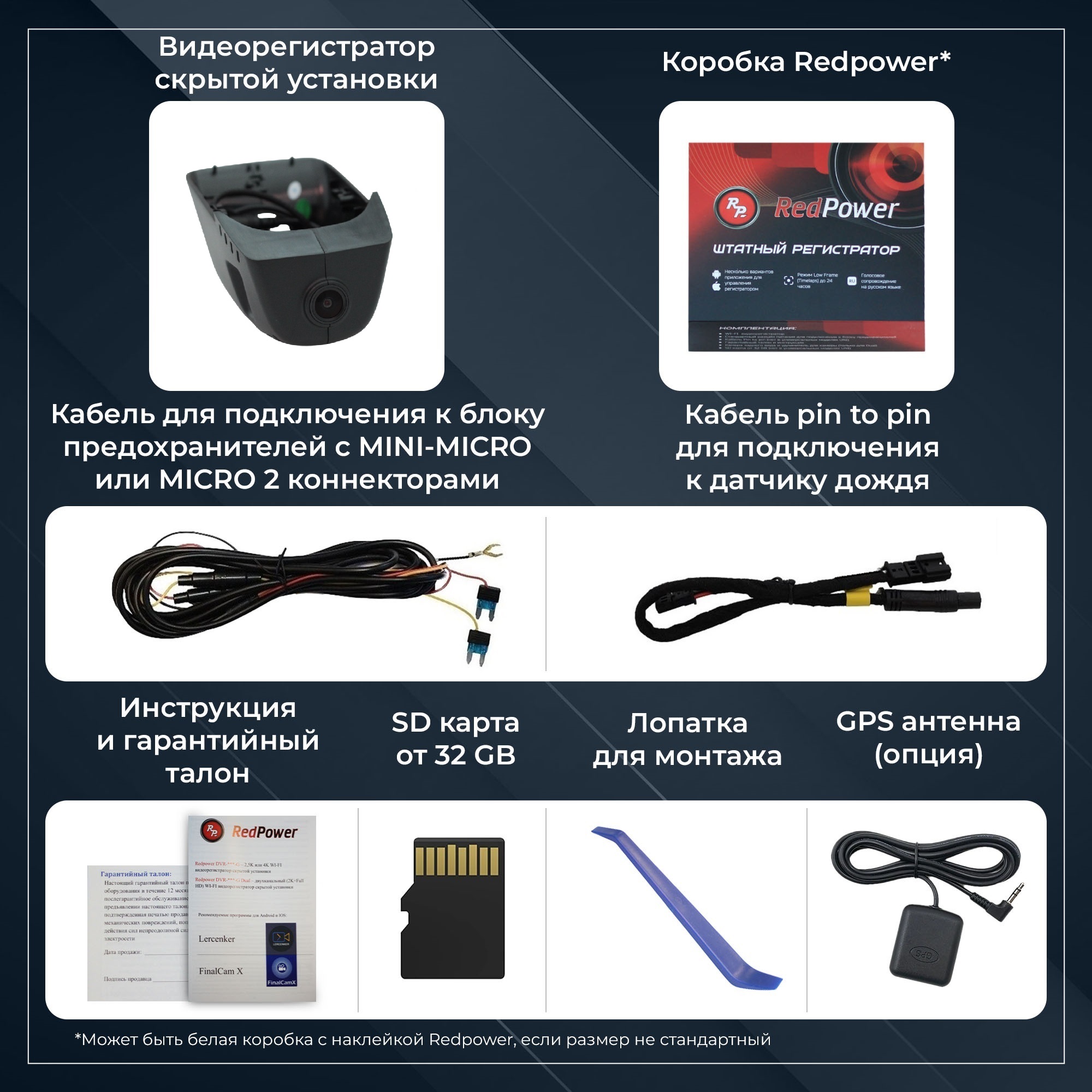 Компания Redpower рада представить новую линейку штатных регистраторов DVR-G серии. Отличия от N серии: новый чип позволяет записывать видео в разрешении 2,5K или 4К, новый сенсор Sony 335, возможность подключения GPS антенны и встроенный конденсатор.